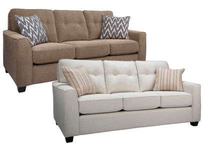 This sofa set boasts deep seating and a semi-attached back with button detailing. Available as a sofa, loveseat, and chair. Crafted by Canadian upholstery specialists. Available in Kayla Ivory and Tracker Wood.Read More