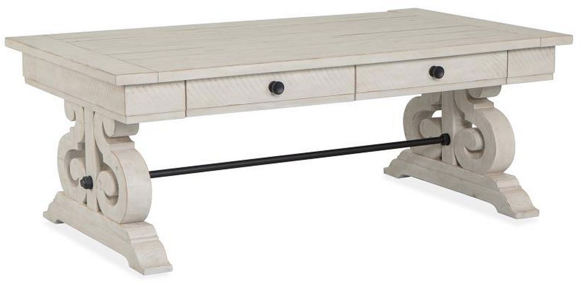 An unforgettable addition to any space, the Bronwyn table collection conveys sophisticated charm. Elegant scrollwork-inspired legs translate a timeless design motif into a stylish aesthetic perfect for today’s homes. Planked tops distinguish Bronwyn’s tabletops and are brought to life in a fresh, clean Alabaster finish accented by hardware in Antique Brass with a Pewter overlay. Shelves and storage drawers make it easy to keep living spaces organized while each table offers its own distinctive personality.