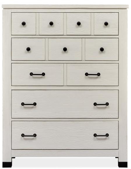 Farmhouse fresh meets industrial chic in the Harper Springs Collection. The board-and-batten construction of the signature panel bed evokes architectural details from 19th and 20th Century farmhouses, and window-pane motifs in textured glass on key pieces are inspired by the black metal windows of classic farmhouses and reclaimed factories. Black metal ferrules, corner brackets and forged iron hardware bring an industrial modern vibe to the craftsmen-like silhouettes. A black metal bed and a black mirror with window-pane border provide a dramatic contrast to the soft Silo White finish with rub-through and distressing. Harper Springs is crafted of random-width solid Pine for an authentic and casual feel. Whether you aspire to loft living or country living, the Harper Springs Collection will bring your dream home to life.