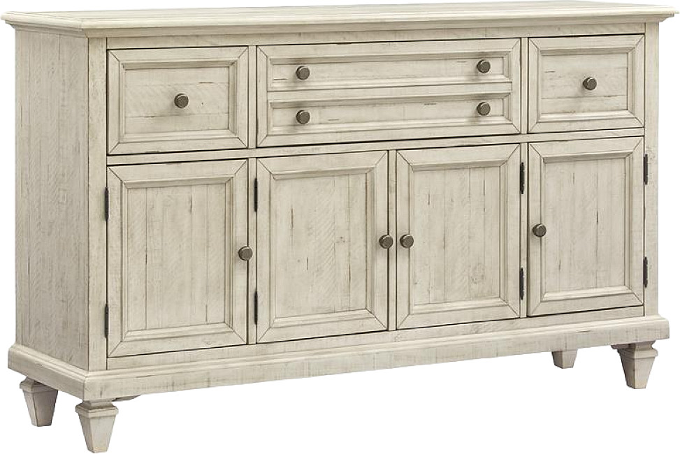 Crafted of high-low Pine and Hardwood Solids, the soft Alabaster finish and Brushed Pewter hardware mix effortlessly with graceful turned legs and designer details to create a look that is bold yet inviting. Adding a casual classic and coastal resort flair, shutter wood doors are used on the server.Read More