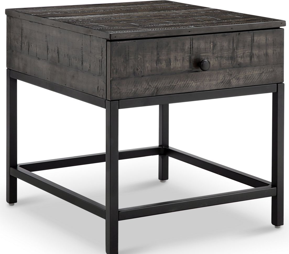 A Distressed Whiskey finish washes the rough pine veneer and hardwood solids and creates a warm contrast to the Matte Black metal table bases and simple knob hardware. A two drawer sofa table showcases the metal stretcher between the square metal tube legs while the lift top cocktail table provides hidden storage beneath the top. Drop in the rectangular end table with a single drawer for easy side table solutions.