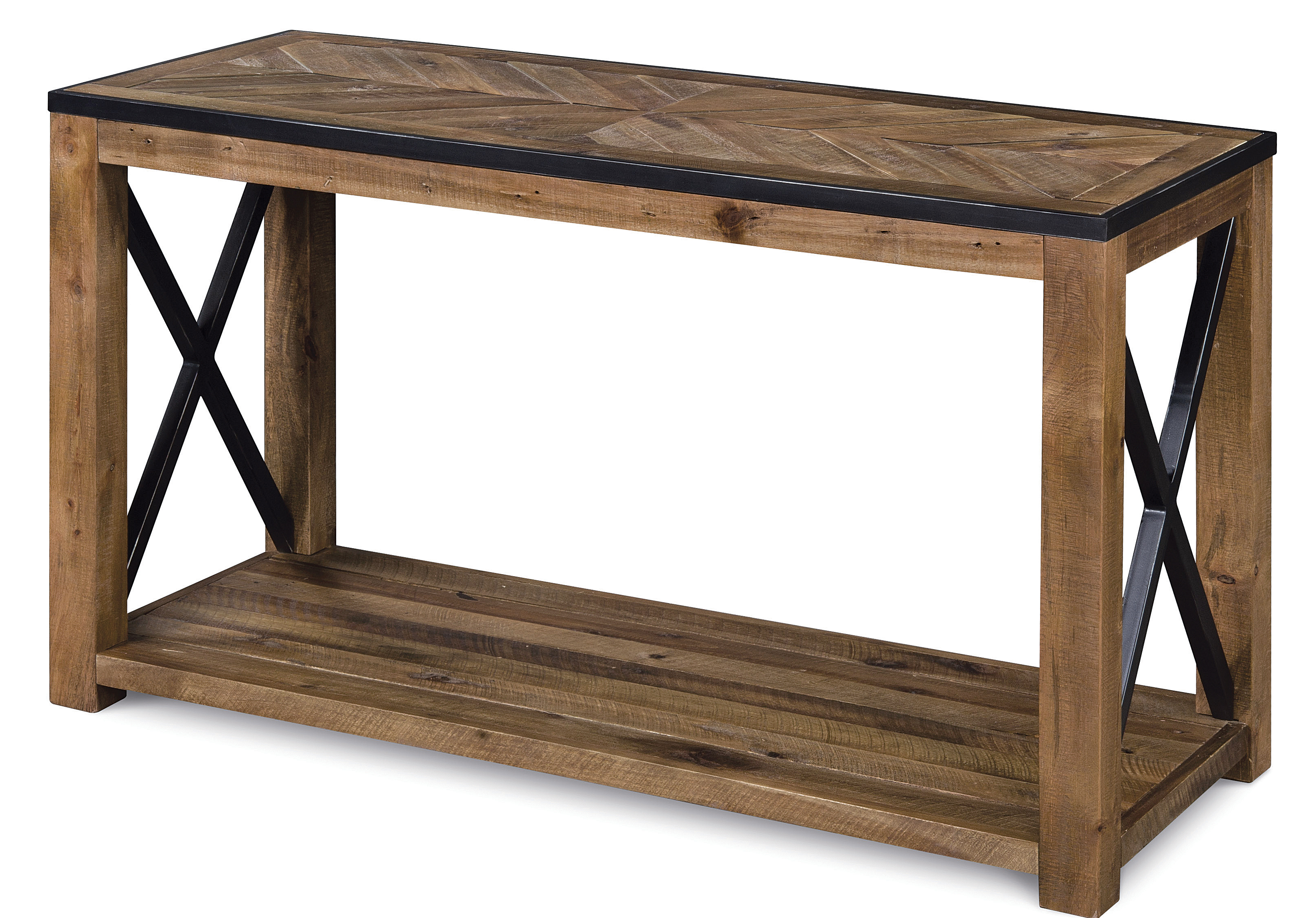 Blocky, boxy, and yet perfectly balanced. Introducing the Penderton table collection. Featuring a stylish, inlaid chevron pattern top, custom bolstered by a thick, ebonized trim. Each one-of-a-kind piece is crafted from wood solids with concealed casters, a natural sienna finish and metal accents.Read More