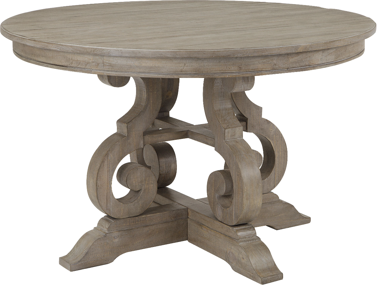 Set the perfect place setting at one of two round dining table sizes that features weathered pine solid tops resting atop open scroll work bases or select the larger rectangular double pedestal carved scroll base table with two butterfly leaves and a handsome weathered bronze metal stretcher.Read More