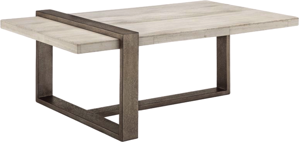 A chunky metal rectangle overlaps the top at one end as the other understated metal rectangle sits underneath on the rectangular end table, conversation stopping cocktail and stunning open sofa table that would complement contemporary upholstered settings delightfully.