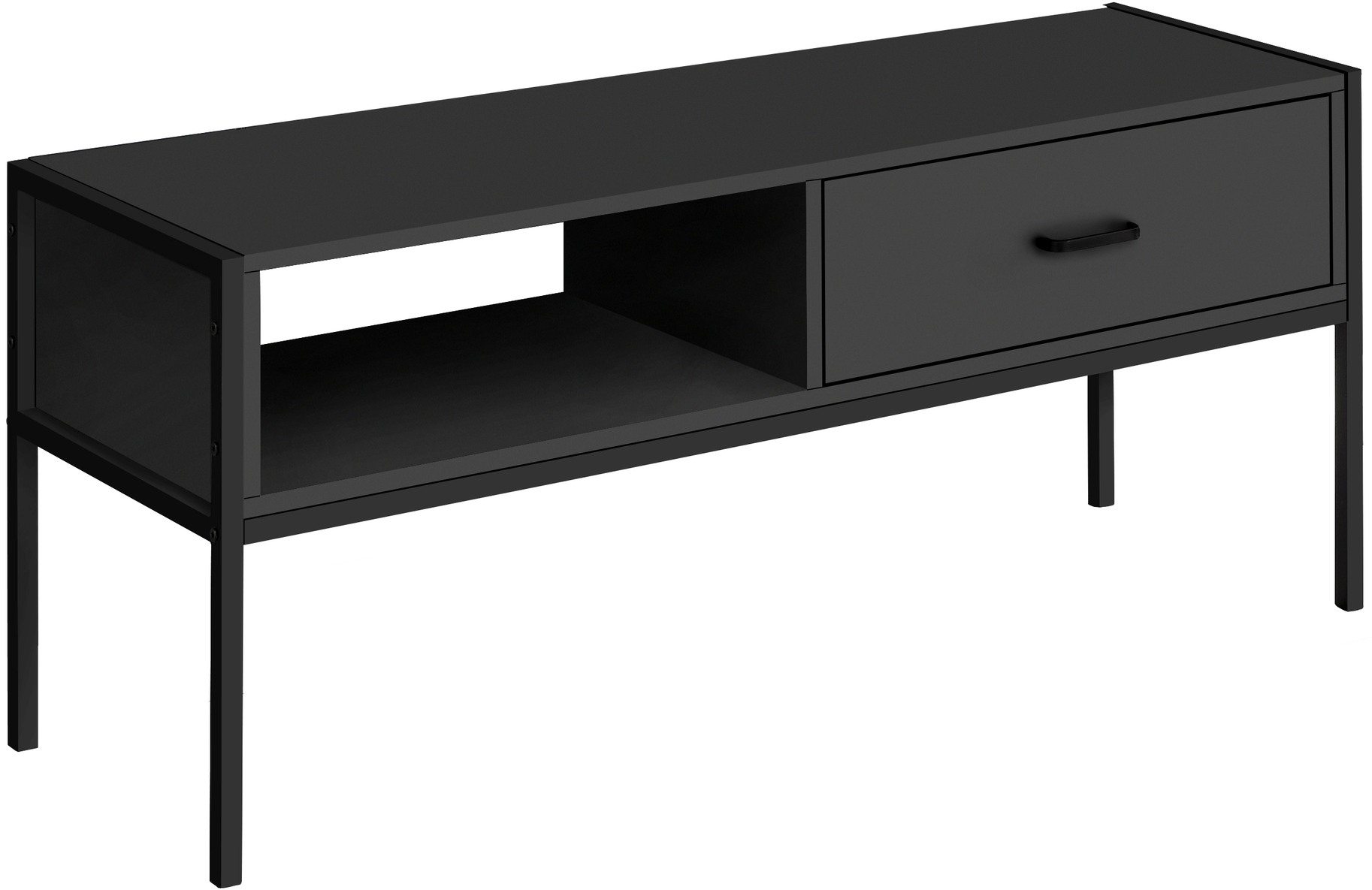 This streamlined TV stand with storage will give your living room or bedroom a leg up on style. Boasting an industrial-inspired design, it features a slender black metal frame with tall legs. The top panel, open shelf, and drawer in a black finish offer flexible storage solutions for your entertainment center components. Most TVs can be accommodated on the top panel when centered, while the shelf underneath is open in the back for easy cable management. The drawer can be positioned on the left or right as desired and glides smoothly on metal drawer slides. With its compact design and clean lines, this media console is great for a condo, apartment, or small home.