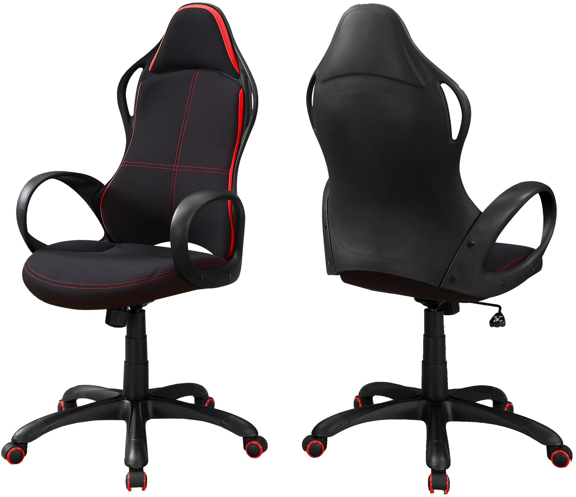 Get ready to bring your gaming to the next dimension with this ultra modern office chair in a rich black finish with red accents to bring out the cool factor. This BIFMA certified swivel chair is upholstered in commercial grade breathable polyester fabric, with thick cushioning along the ergonomically curved back and seat for ultimate comfort. The sleek rounded armrests ties it all together for this race car inspired chair design. Easily adjust the seat height with the convenient side lever and sit back and relax with the tilt lock-in/free mechanism. The five eye-catching nylon castors smoothly glide across the floor for easy mobility.