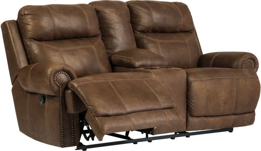 The Austere reclining loveseat with console lives up to its name—if we’re talking sparing that "puffy" look you might expect from a recliner. When it comes to contemporary style, it doesn't hold back. Subtle touches such as sporty jumbo stitching, nailhead trim and a "weather worn" effect on the upholstery provide a buttoned-up appeal and fresh feel. Center console with dual cup holders brings a handy element to this handsome piece.