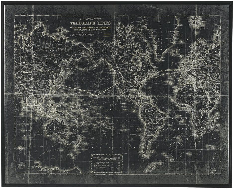 This large Berit wall art reproduction shows the global telegraph lines of the late 19th century, the first time the entire globe was free to communicate and connect to one another.