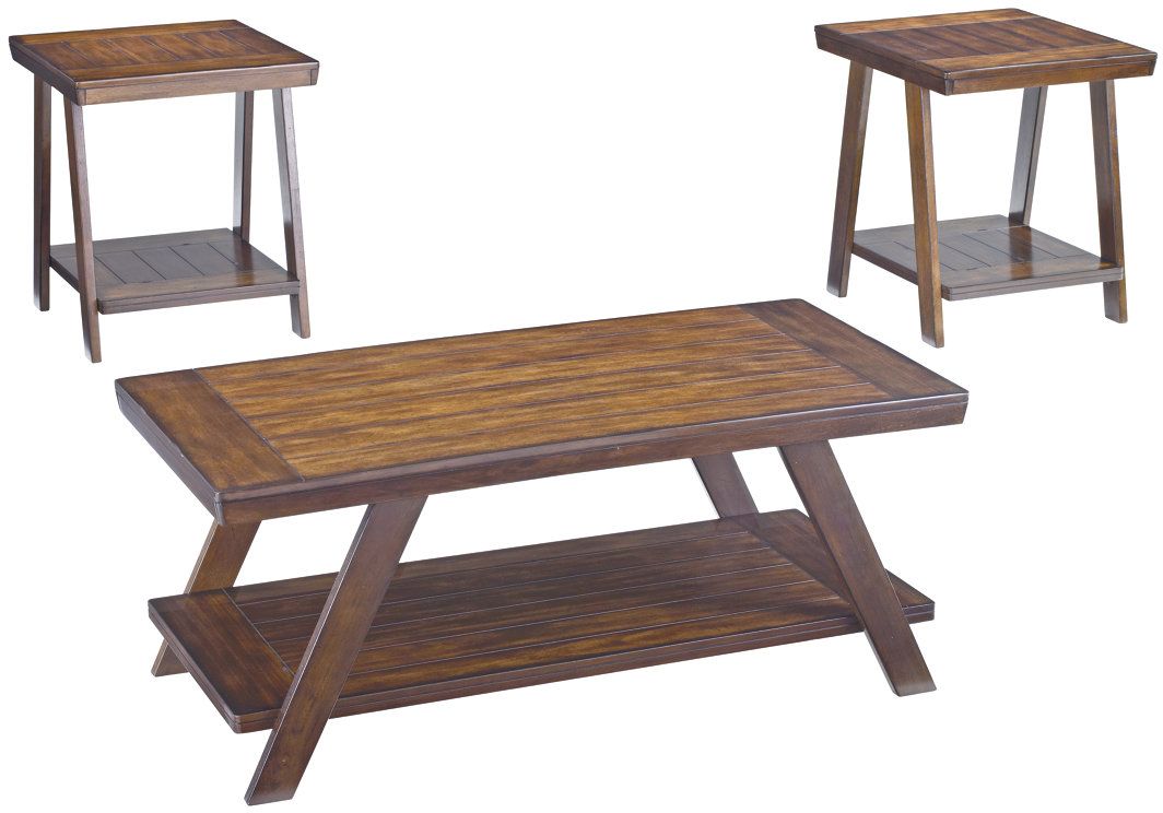 Gently aged finish and replicated plank details offer rustic qualities to a traditional trestle-style design. Coffee table set’s bottom shelves provide display space for magazines, books and accessories galore. Ideally suited for a multitude of aesthetics, from vintage to traditional and even industrial.