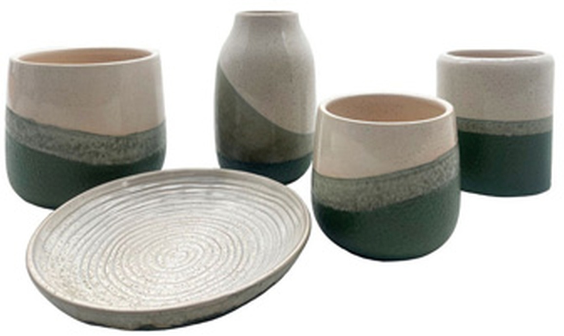 Set of 5 accessories. Indoor/outdoor safe. Tray and 4 vases. Green and cream glazed ceramic.Read More