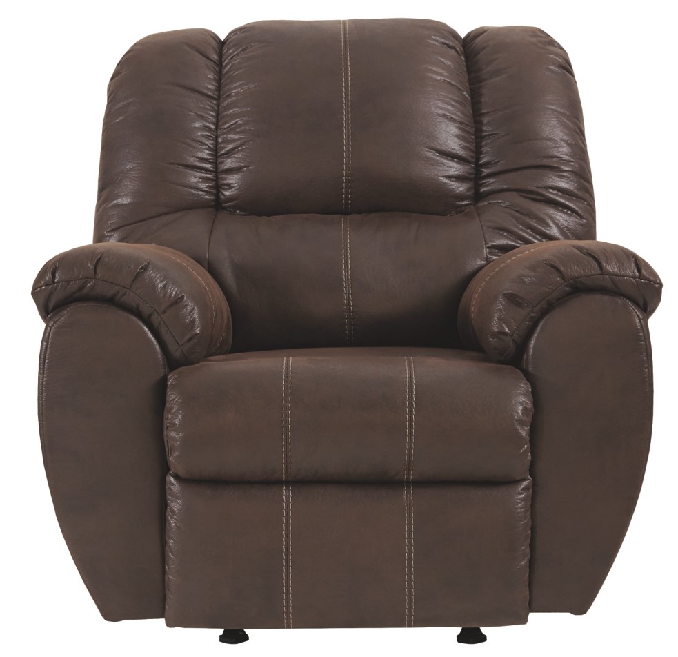 Rock the cool look of leather and the warm feel of fabric with this rocker recliner. Sporting sumptuously thick cushioning, fashion-forward jumbo stitching and a richly tailored aesthetic, this smartly priced recliner with gentle rocking motion is a bestseller for good reason.Read More