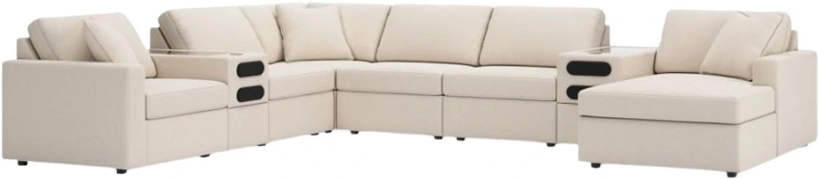Includes 8 modular pieces: left-arm facing corner chair, 2 audio consoles with storage, wedge, 3 armless chairs and right-arm facing corner chaise