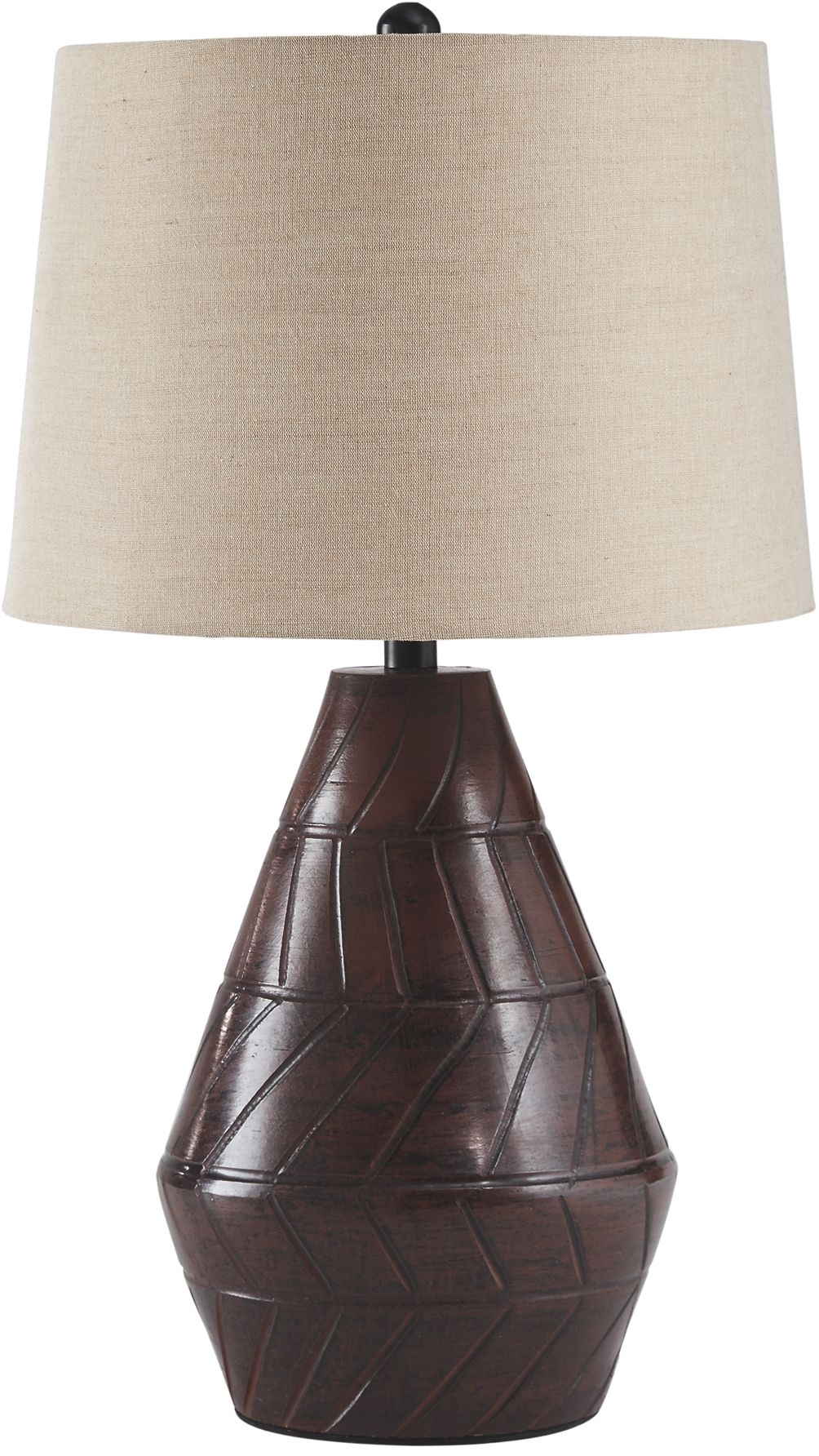 Complement the lines of your home with the grooved chevron pattern of the Nelina table lamp. Complete the feel of any room with warm light from the tan-toned, modified drum shade.