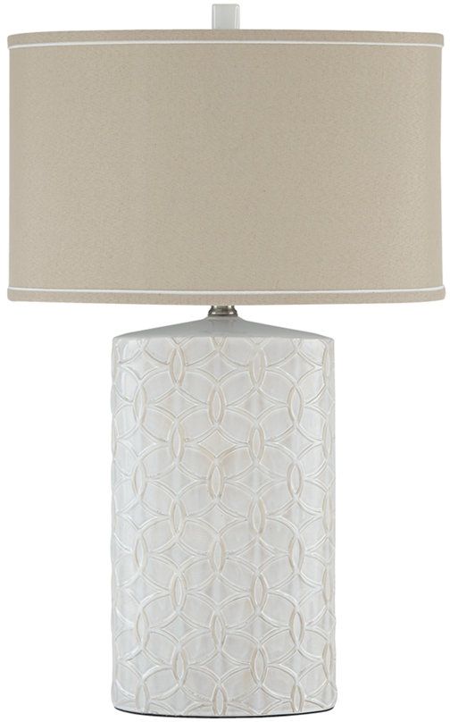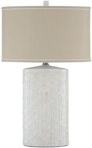 Behold! The glossy ceramic glaze of the Shelvia table lamp is not just beautiful—it also provides durability. The oval-shaped fabric drum emits a warm glow with the easy twist of the 3-way switch.