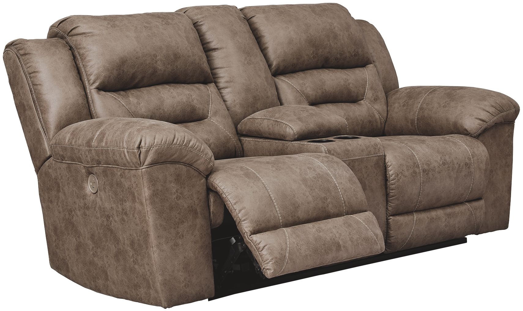 For those that love the cool look of leather but long for the warm feel of fabric, this power reclining loveseat delivers both with ease. Its high-performance padded faux leather is remarkably durable and easy to clean, just the thing for family spaces. When it’s time to relax, the one-touch power control puts the perfect position at your fingertips. Channel-stitched back cushions provide indulgent lumbar support for maximum seating comfort—not to mention fashion-forward flair.