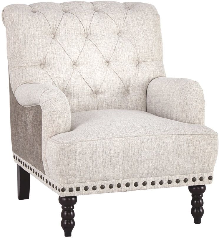 Fresh and sophisticated. This accent chair with button tufting is a classy addition to your home. Inside-out design with linen weave fabric on the seating area and taupe faux leather on the back. Large nailhead trim ties the look together. Charles of London arms and turned bun feet make this a stylish heirloom piece.