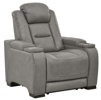 Add a style in your room with this power recliner from The Man-Den collection. This recliner is shown in gray color finish and features a upholstered back and seat, nailhead trims and an arm storage.Read More