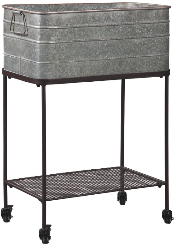 Help yourself to a retro-chic sense of style with the Vossman beverage tub with stand. Smooth-gliding casters and metal grill shelf for glasses and bottles let the good times roll. Galvanized metal finish makes it feel so authentic.Read More